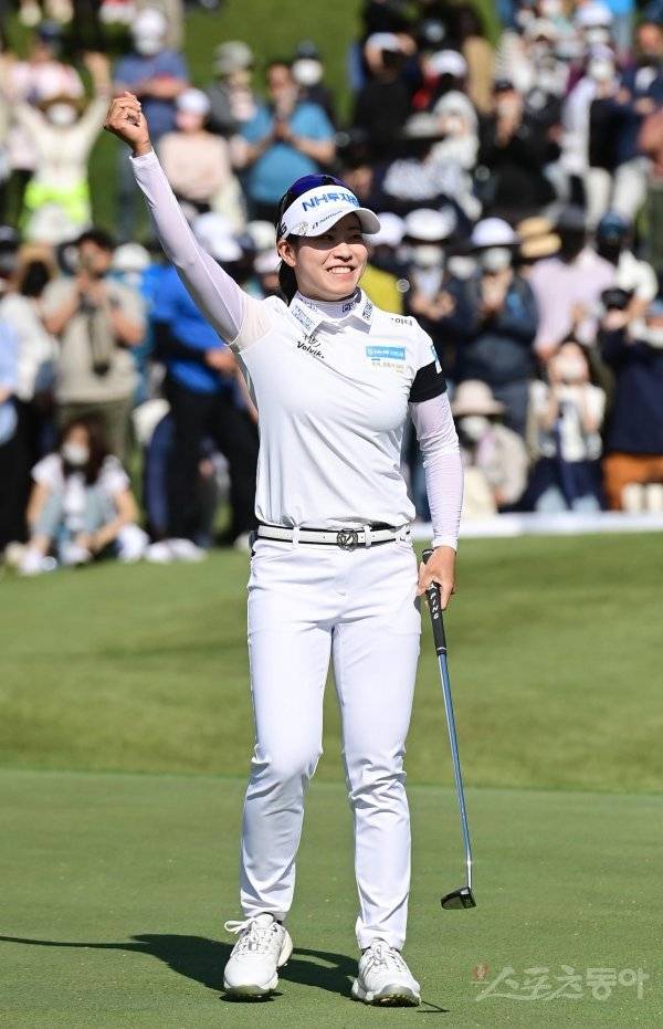 15일 경기도 용인시 수원컨트리클럽에서 열린 KLPGA투어 ‘2022 NH투자증권 레이디스 챔피언십’에서 박민지가 11언더파로 우승을 확정지은 뒤 세리머니를 하고 있다.