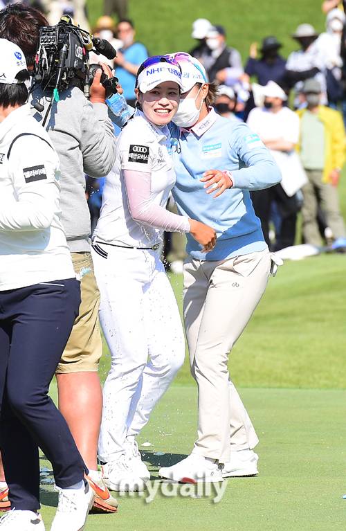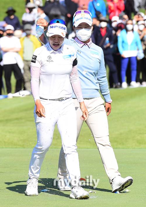 [마이데일리 = 수원 곽경훈 기자] 박민지가 15일 오후 경기도 수원 컨트리클럽에서 진행된 한국여자프로골프(KLPGA)투어 '2022 NH투자증권 레이디스 챔피언십(총상금 8억원)' 3라운드에서 우승을 차지한 뒤 동료들의 축하를 받고 있다.