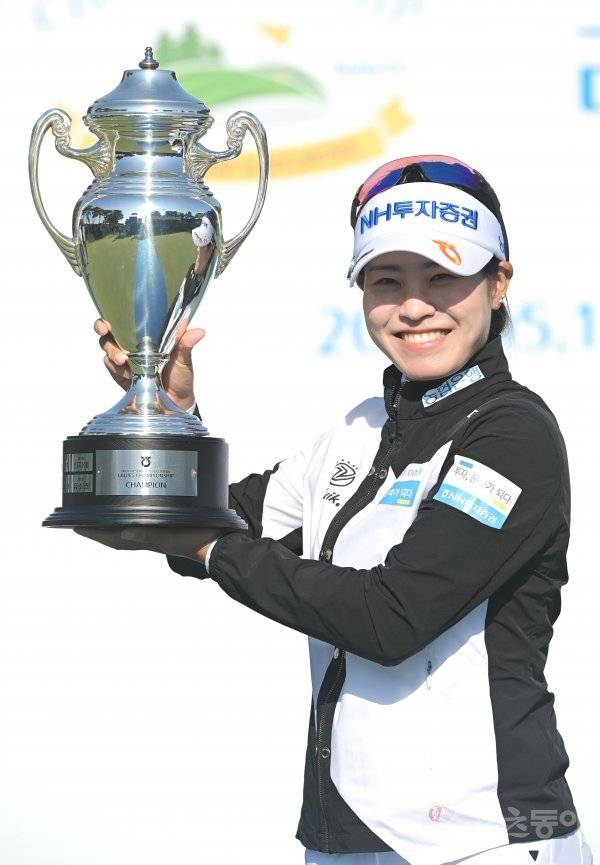 15일 경기도 용인시 수원컨트리클럽에서 열린 KLPGA투어 ‘2022 NH투자증권 레이디스 챔피언십’에서 박민지가 11언더파로 우승을 확정지은 뒤 포즈를 취하고 있다.