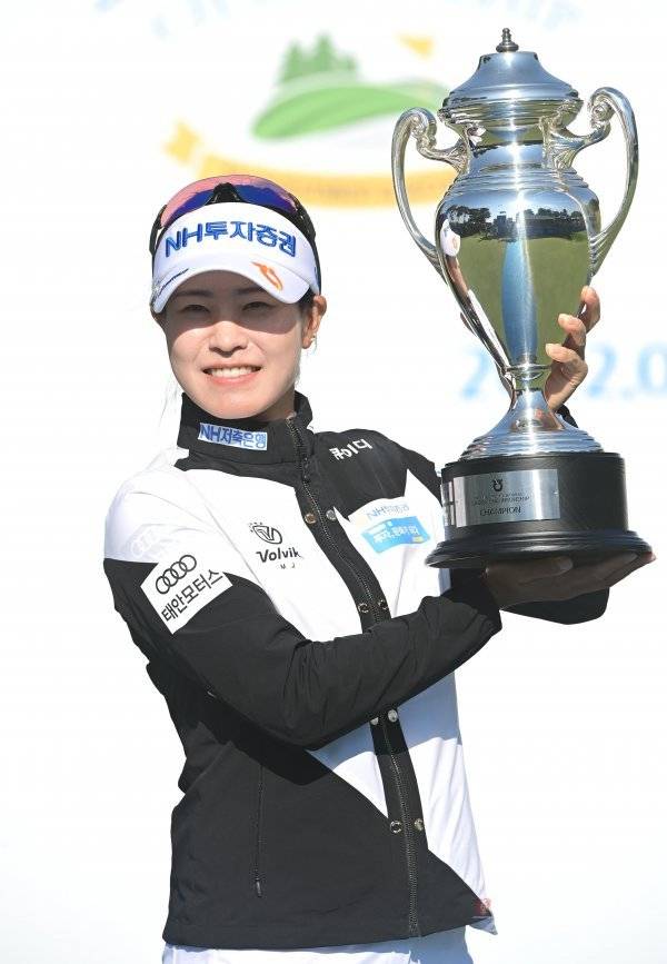 15일 경기도 용인시 수원컨트리클럽에서 열린 KLPGA투어 ‘2022 NH투자증권 레이디스 챔피언십’에서 박민지가 11언더파로 우승을 확정지은 뒤 포즈를 취하고 있다.