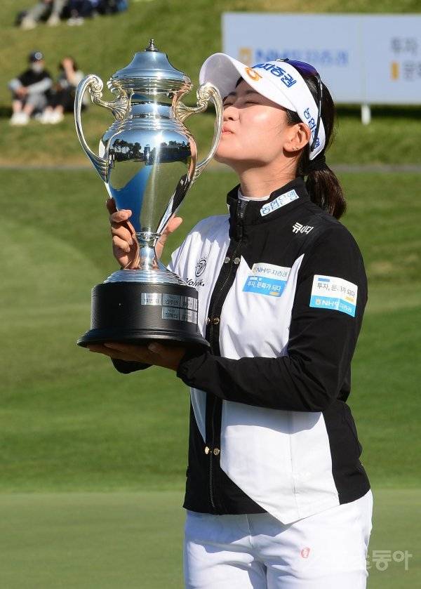 15일 경기도 용인시 수원컨트리클럽에서 열린 KLPGA투어 ‘2022 NH투자증권 레이디스 챔피언십’에서 박민지가 11언더파로 우승을 확정지은 뒤 트로피를 들고 포즈를 취하고 있다.