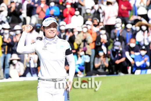 [마이데일리 = 수원 곽경훈 기자] 박민지가 15일 오후 경기도 수원 컨트리클럽에서 진행된 한국여자프로골프(KLPGA)투어 '2022 NH투자증권 레이디스 챔피언십(총상금 8억원)' 3라운드에서 우승을 차지한 뒤 기뻐하고 있다.