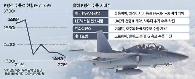 방위사업청의 방산업체 경영실태 자료에 따르면 K방산 해외 매출액은 2015년과 2016년 각각 2조6357억원과 2조7358억원을 기록해 사상 최대 실적을 올렸다.