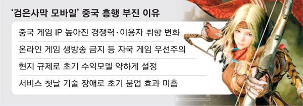 지난 13일 펄어비스 1분기 실적 발표 콘퍼런스콜. 이 회사가 중국에 출시한 '검은사막 모바일(검사모)'의 초반 흥행 부진과 관련해 질문이 쏟아졌다. 검사모는 2017년 사드 사태 이후 중국 시장에서 판매 허가(판호)를 받아 정식 출시까지 이어진 첫 사례로 주목받은 게임이다. 지난달 26일 출시 첫날 중국 앱스토어 게임 인기(내려받기) 순위 1위에 올라서는 등 기대를 모았지만 이후 매출 순위가 100위권 밖으로 밀려나는 등 초반부터 흥행 부진을 겪고 있다.