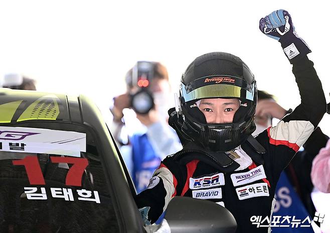 (엑스포츠뉴스 태백, 김한준 기자) 15일 오후 강원도 태백스피드웨이에서 진행된 ‘넥센스피드레이싱 & 태백 모터스포츠 페스티벌’ 2라운드 경기, RV-300에서 우승을 차지한 김태희가 기뻐하고 있다.