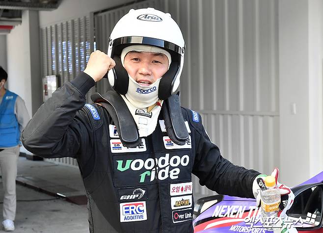 (엑스포츠뉴스 태백, 김한준 기자) 15일 오후 강원도 태백스피드웨이에서 진행된 ‘넥센스피드레이싱 & 태백 모터스포츠 페스티벌’ 2라운드 경기, RV-300에서 2위를 차지한 신두호가 포즈를 취하고 있다.