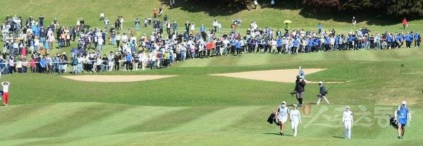15일 경기도 용인시 수원컨트리클럽에서 열린 KLPGA투어 ‘2022 NH투자증권 레이디스 챔피언십’ 18번홀에서 갤러리들이 챔피언조와 그린으로 향하고 있다.