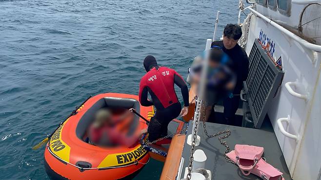 서귀포해양경찰서에 따르면 오늘(15일) 낮 12시 29분께 서귀포시 안덕면 황우치해변 앞 해상에서 캐나다 국적 외국인 3명을 태운 고무보트가 떠내려가고 있다는 낚시객의 신고가 접수됐습니다.