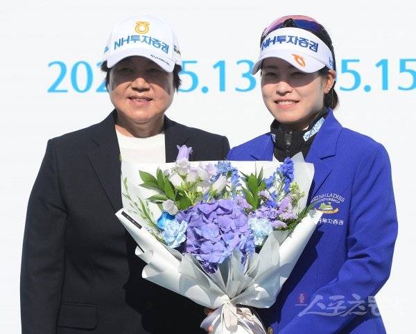 15일 경기도 용인시 수원컨트리클럽에서 열린 KLPGA투어 ‘2022 NH투자증권 레이디스 챔피언십’에서 박민지가 11언더파로 우승을 확정지은 뒤 강춘자 한국여자프로골프협회 대표와 기념 촬영을 하고 있다.