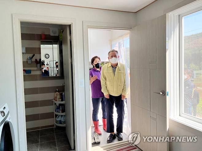 (동해=연합뉴스) 이상민 신임 행정안전부 장관이 15일 지난 3월 대형산불이 발생한 강원 동해시 망상동 산불 피해 현장을 방문, 이재민들이 생활하는 임시 조립주택을 둘러보고 있다. 2022.05.15 [동해시 제공. 재판매 및 DB 금지]