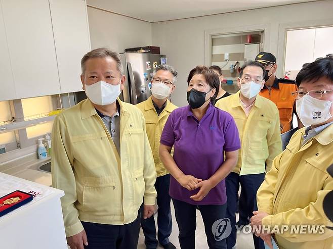 (동해=연합뉴스) 이상민 신임 행정안전부 장관이 15일 지난 3월 대형산불이 발생한 강원 동해시 망상동 산불 피해 현장을 방문, 이재민들이 생활하는 임시 조립주택을 둘러보고 있다. 2022.05.15 [동해시 제공. 재판매 및 DB 금지]