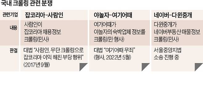 법원의 판단은 엇갈리게 나오고 있다. 여기어때는 지난 12일 대법원에서 무죄를 확정받았다. 불법 크롤링 판정을 받은 2017년 사람인과 잡코리아 간 분쟁 결과와는 대비되는 판결이다. 법조계에서는 “합법과 불법 크롤링 기준에 윤곽이 드러나고 있다”는 분석이 나온다.