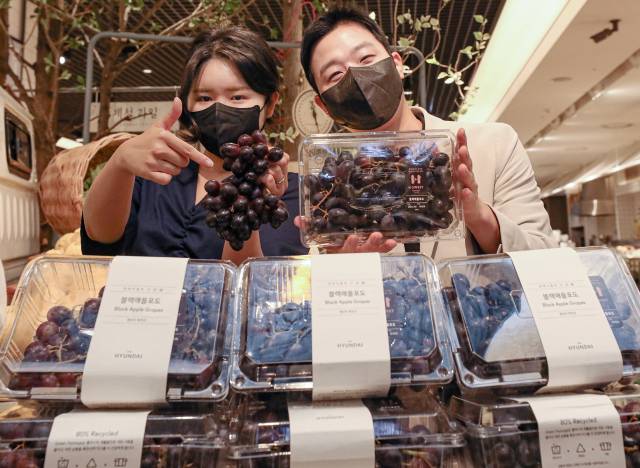 현대백화점(069960)이 오는 19일까지 전국 16개 전 점포 식품관에서 '블랙애플포도'를 판매하는 가운데 15일 서울 강남구 무역센터점에서 직원들이 상품을 선보이고 있다. 블랙애플포도는 호주산으로 일반 포도보다 당도가 30%이상 높고 아삭한 식감이 특징이다./사진제공=현대백화점
