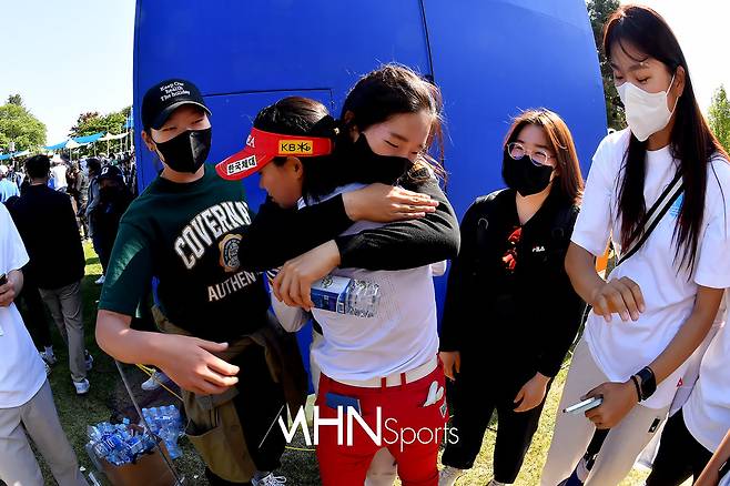 국가대표 선수들이 황유민을 위로 해주고 있다.