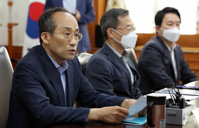 추경호(왼쪽) 부총리 겸 기획재정부 장관이 15일 정부서울청사에서 열린 경제관계장관 간담회에서 발언하고 있다. 추 부총리는 “우리 경제가 매우 엄중하고 위급하다”며 “새 정부 경제팀은 부처 간 칸막이를 넘어 원팀으로 합심해 물가 및 민생 안정을 위한 효과적인 정책 과제 발굴에 역량을 모아야 한다”고 강조했다. 오승현 기자