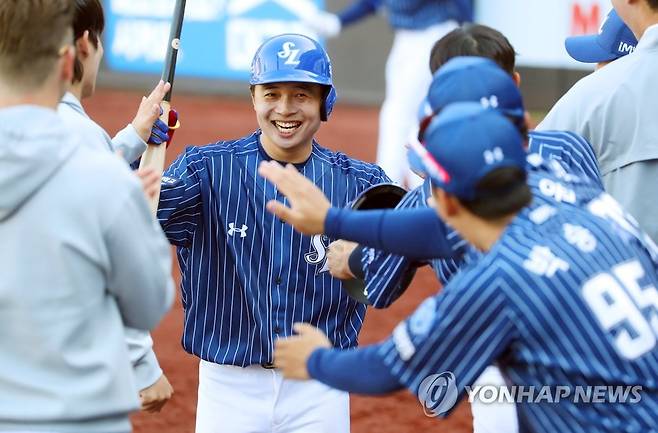 (대구=연합뉴스) 김현태 기자 = 15일 대구 삼성라이온즈파크에서 열린 프로야구 '2022 신한은행 쏠(SOL) KBO 리그' 두산 베어스와 삼성 라이온즈의 경기. 8회 초 1사 주자 1, 3루 동점 상황에서 삼성 김헌곤이 1점 결승타를 친 후 동료들의 축하를 받고 있다. 2022.5.15