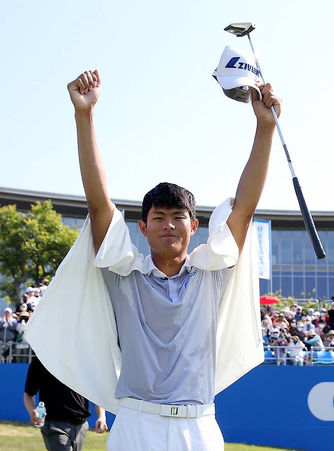 [서울=뉴시스] 추상철 기자 = 15일 경기 여주시 페럼CC에서 열린 2022 KPGA 우리금융 챔피언쉽 우승자 장희민이 세레머니하고 있다. (사진=KPGA 제공) 2022.05.15. photo@newsis.com *재판매 및 DB 금지
