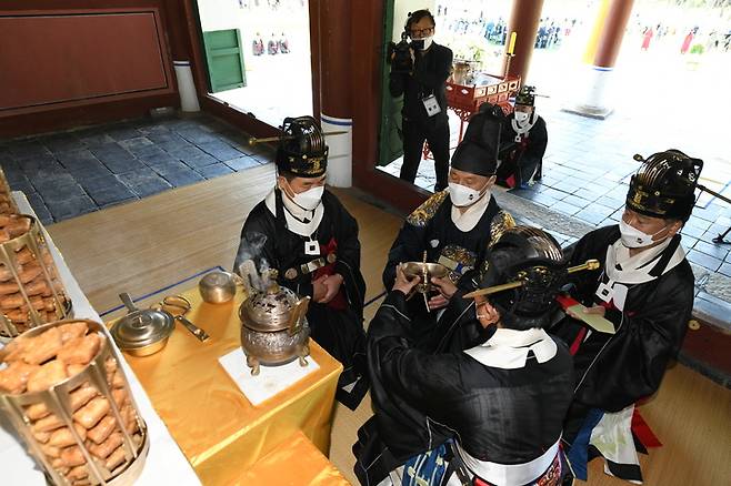 [서울=뉴시스] 추상철 기자 = 15일 오전 경기 여주시 영릉에서 열린 제625돌 숭모제전에서 제관들이 향을 올리고 있다. (사진=문화재청 제공) 2022.05.15. photo@newsis.com *재판매 및 DB 금지