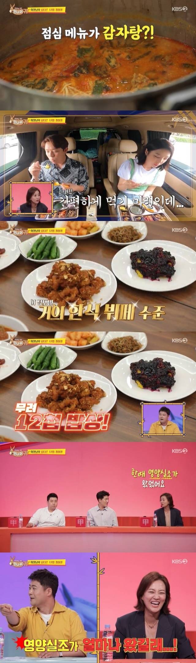 이날 점심식사엔 무려 곰솥이 등장했다. 안에 있는 메뉴는 바로 감자탕. 김숙, 전현무가 "솥을 들고 다니는 거냐"며 놀라자 장윤정은 "식당에서 공수한 것"이라고 답했다.