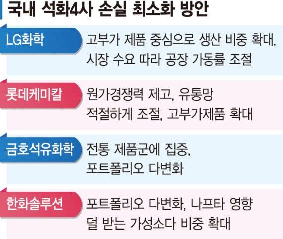 15일 관련 업계에 따르면 국내 석화4사(LG화학, 롯데케미칼, 금호석유화학, 한화솔루션)는 1·4분기 이후 손실을 최소화하기 위한 전략을 세우고 있다.