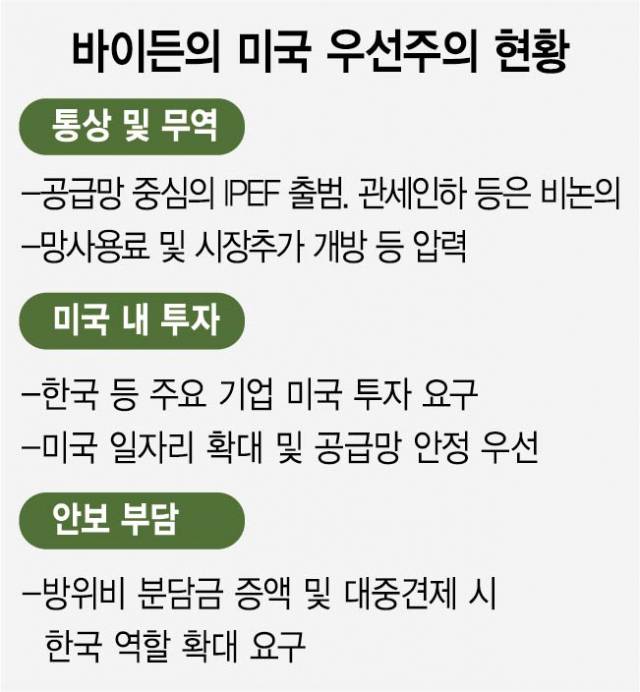 IPEF 참여국들은 미국 중심으로 공급망을 개편하게 되지만 관세 인하나 미국 시장 진출 확대 혜택을 받지는 못한다. 바이든 대통령이 방한 기간에 삼성과 현대차·SK·LG 등 주요 그룹 총수들을 만나게 되면 미국 내 추가 투자를 압박할 수도 있다. 주유엔 싱가포르 대사를 지낸 토미 코는 “미국은 안보라는 단일 초점으로 이 지역에 접근하는 경향이 있다”며 “하지만 아시안들은 무역으로 살아간다”고 지적했다.