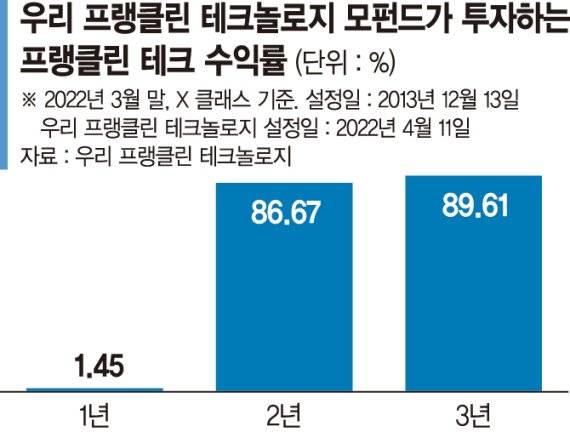 프랭클린 테크놀로지 펀드의 수익률은 X클래스 3월 말 기준 1년 1.45%, 2년 86.67%, 3년 89.61% 순이다.