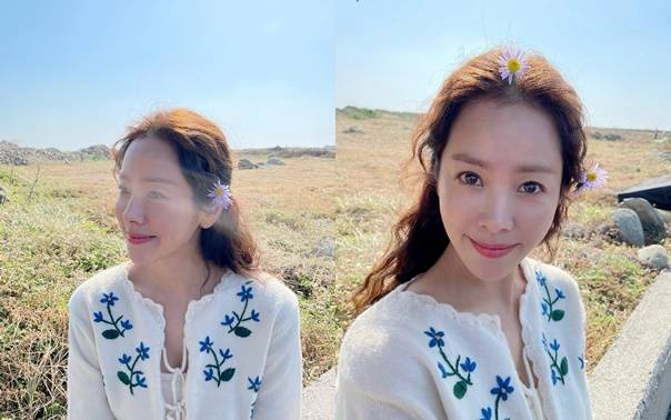 사진 속에는 머리에 꽃을 꽂고 있는 한지민의 모습이 담겼다. 그가 입고 있는 가디건에도 꽃자수가 새겨져있다. 한지민은 41세라는 나이가 믿기지 않을 정도로 어려보이는 외모와 깨끗한 피부를 자랑했다.