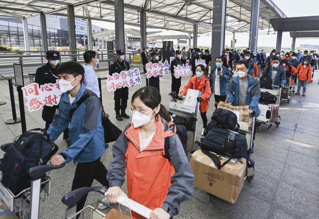 코로나19 검사를 위해 중국 상하이로 파견됐다가 후베이성으로 돌아가는 검사원들이 14일 공항 직원들의 감사 인사를 받으며 상하이 공항의 탑승 게이트로 향하고 있다.