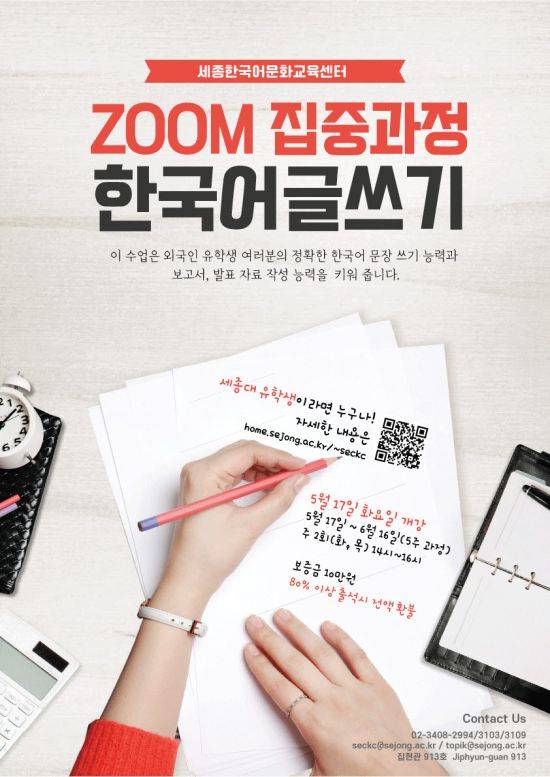 [아시아경제 장세희 기자]세종대학교 세종한국어문화교육센터는 'ZOOM 집중과정 한국어 글쓰기' 교육을 진행한다고 15일 밝혔다.