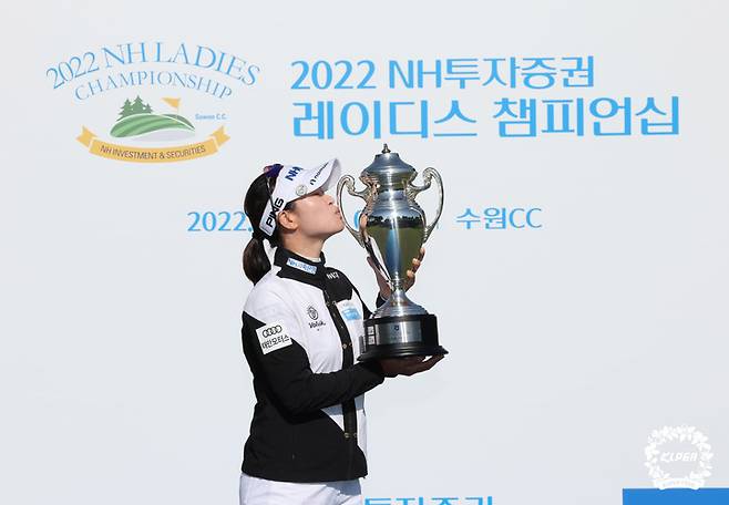 [서울=뉴시스] 추상철 기자 = 15일 경기 용인시 수원CC에서 열린 '2022 NH투자증권 레이디 챔피언십' FR, 우승을 차지한 박민지가 트로피에 입을 맞추고 있다. (사진=KLPGA 제공) 2022.05.15. photo@newsis.com *재판매 및 DB 금지