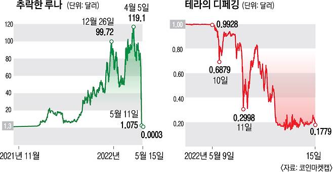 코인발행사 테라폼랩스가 발행한 테라는 코인 1개당 가치가 1달러에 연동되도록 설계된 ‘스테이블 코인’이다. 루나는 이러한 테라를 뒷받침하는 용도의 자매 코인인데, 테라의 가격을 유지하기 위해 루나를 소각하거나 발행하는 식으로 알고리즘이 짜여 있다. 이번 사태는 지난 7일 테라의 가격이 1달러보다 떨어지는 ‘디페깅’ 현상이 발생하며 촉발됐다. 불안해진 투자자들이 루나를 팔아 치우며 결국 가격이 99.99% 이상 폭락하게 된 것이다.