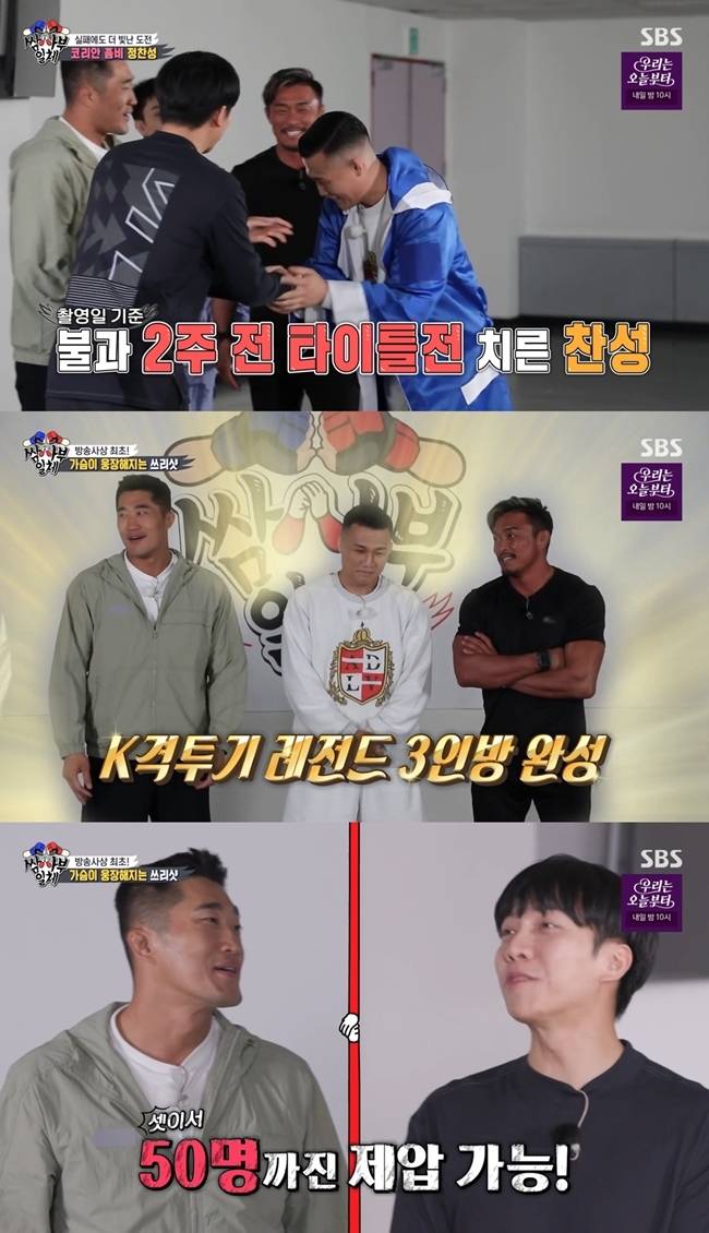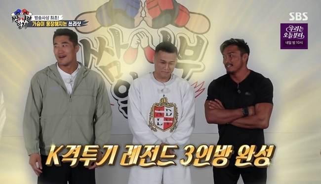 양세형은 "세 명이 합쳐져 있는데 전투력이 너무 높다"고 웃었고 이승기는 "길거리에 이렇게 세 명 걸어가면 아무도 못 건드리겠다"고 감탄했다. 그러자 김동현은 "50명까지 괜찮다"며 너스레를 떨었다.