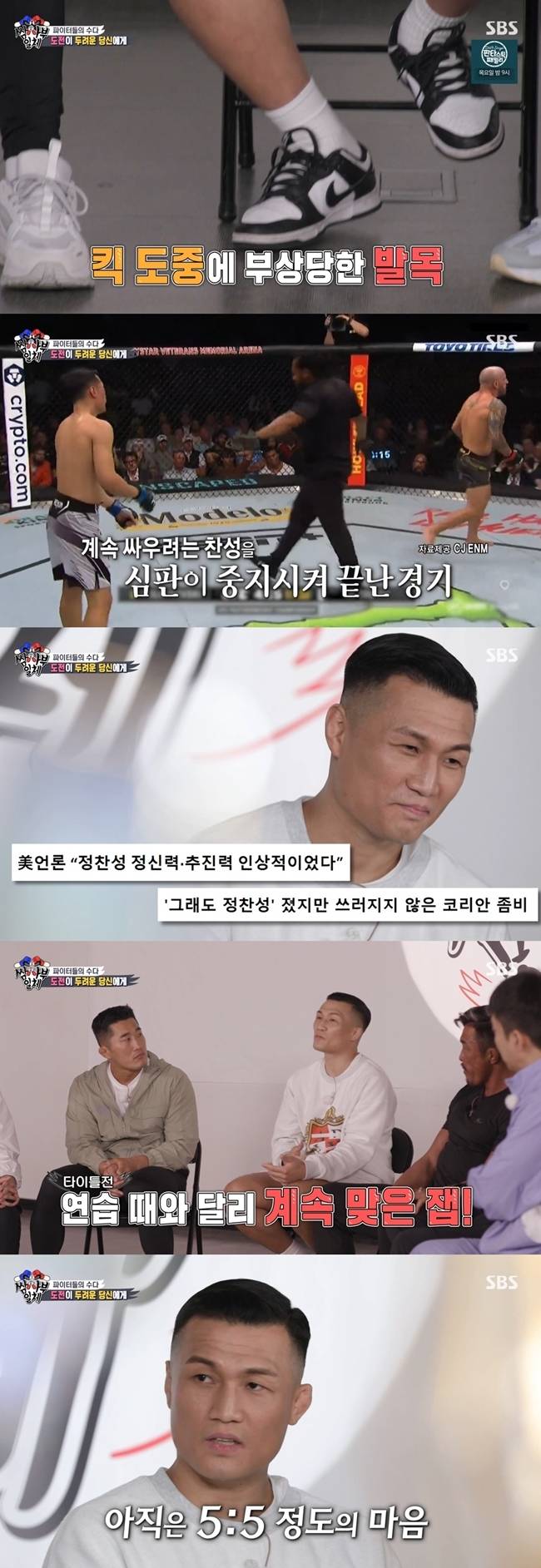 경기 중 발목 부상을 입었다는 정찬성은 "마음을 제일 많이 다쳤다. 평생 이것만 보고 운동했는데 꿈이 멈추니까 다 잃은 것 같았다"고 털어놨다.