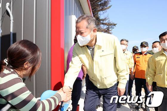 (서울=뉴스1) 장수영 기자 = 이상민 행정안전부 장관이 15일 지난 3월 대형 산불이 발생한 강원 동해시에 방문해 임시조립주택으로 입주한 주민을 위로하고 있다. (행정안전부 제공) 2022.5.15/뉴스1