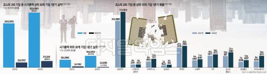 이에 반해 코스피 200대 기업의 맨 뒤에 있는 30개 기업의 매출액 합계는 44조2959억원 전년 동기보다 15.7% 늘어 평균치를 하회했다. 영업이익은 2조4299억원으로 1년 전보다 오히려 11.3% 줄었다. 철강·상사 등 일부 업종을 제외하고는 전반적으로 실적 부진을 면치 못했다.
