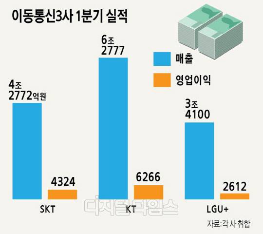 15일 이통업계에 따르면, 올 1분기 이동통신 3사 연결 기준 영업이익은 총 1조3202억원으로, 지난해 1분기 보다 20.7% 증가한 것으로 집계됐다. 각사별로 올 1분기 영업이익은 SK텔레콤 4324억원, KT 6266억원, LG유플러스 2612억원을 기록했다. 전년 동기 대비 SK텔레콤은 15.5%, KT는 41.1% 늘었고 LG유플러스는 플래그십 단말기 출시 지연 등의 영향으로 5.2% 감소했다.