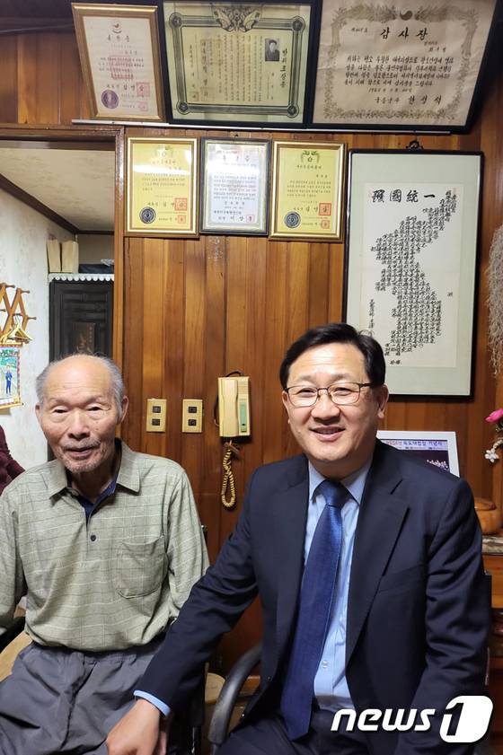 (포항=뉴스1) 최창호 기자 = 재단법인 독도의용수비대기념사업회 서영득 회장이 15일 오후 경북 포항시 남구에 위치한 생존 독도의용수비대원인 최부업 옹 자택을 찾아 위문품을 전달하고 격려했다.(독도의용수비대기념사업회제공)2022.5.15/뉴스1