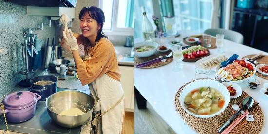 공개된 사진 속 심이영은 손으로 수제비 반죽을 떼어내면서 미소짓는 모습이다. 이어 식탁에 차려진 수제비를 비롯해 연어 샐러드, 과일 등이 푸짐하게 놓인 식탁을 본 네티즌들은 감탄을 자아냈다.