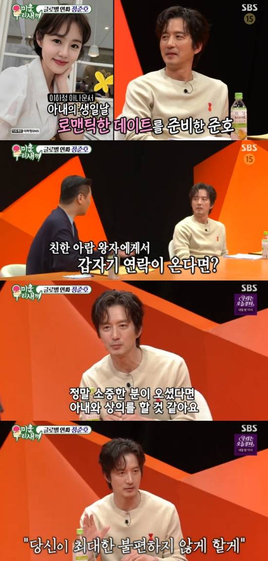정준호는 "정말 소중한 분이 오셨다고 하면 와이프와 상의를 할 거다. 와이프한테 이야기를 한다. '갑자기 이분이 오셨는데 내가 안 볼 수는 없고 머리 좀 써서 당신이 최대한 불편하지 않게 할 테니까 이해만 해달라'라고 할 거다. 합석은 아니고 내가 예약한 레스토랑 옆자리에 예약을 할 거다"라며 설명했다.