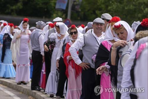 Men and women dressed in traditional Madrid regional dress and known as 'Chulapos and Chulapas' queue to have their photos taken during the San Isidro festivities in Madrid, Spain, Sunday, May 15, 2022. The festivities during the bank holiday weekend honour of the patron saint of Madrid. (AP Photo/Paul White)