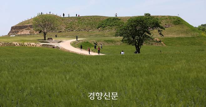 쾌청한 봄 날씨를 보인 15일 경기 연천군 고구려 유적지 호로고루를 찾은 시민들이 성벽 아래 펼쳐진 청보리밭 사잇길을 걷고 있다.