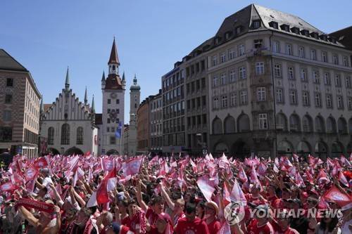 Bayern Munich supporters gather in front of the town hall at Marienplatz square celebrating the 31th Bundesliga title at the German Bundesliga in Munich, Germany, Sunday, May 15, 2022. (AP Photo/Matthias Schrader) THE DEUTSCHE FUSSBALL LIGA DFL DOES NOT ALLOW THE IMAGES TO BE USED AS SEQUENCES TO EMULATE VIDEO.