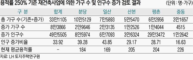 분당은 1기 신도시 설계 당시 총 1963.9ha 면적에 9만7580가구를 건설, 2030년까지 총 39만320명 수용을 목표로 했지만 올해 3월 기준 분당의 총 가구 수 및 인구수는 각각 15만8342가구, 48만4318명으로 늘었다. 일산은 1573.6ha에 6만9000가구를 건설해 27만6000명을 수용하는 것을 목표로 만들어졌으나, 지난해 말 기준 일산 동구·서구의 총인구만 59만명을 넘어섰다. 분당과 일산의 인구만 합해도 1기 신도시가 설계될 당시 목표한 인구 117만명을 거의 채우는 셈이다.