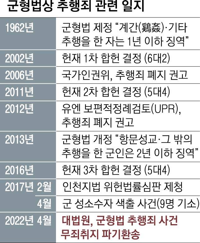 1962년 군형법 제정 당시 미국 전시법을 차용하면서 시작된 추행죄는 위헌 논란이 끊이질 않았다. 그러나 헌법재판소는 2002년과 2011년, 2016년 합헌 결정을 내렸다. 군의 특수성과 전투력 보존을 위해 동성 군인을 차별 취급할 이유가 있다는 논리였다.
