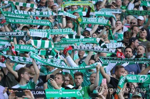 epa09948801 Bremen's supporters hold scarfs before the German Second Bundesliga soccer match between SV Werder Bremen and Jahn Regensburg in Bremen, northern Germany, 15 May 2022. EPA/FOCKE STRANGMANN CONDITIONS - ATTENTION: The DFL regulations prohibit any use of photographs as image sequences and/or quasi-video.