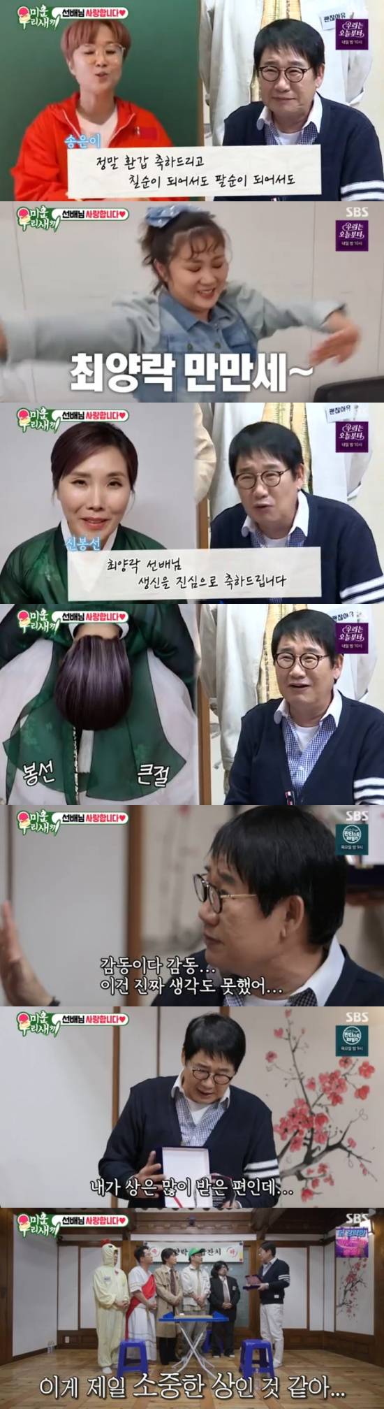 최양락은 눈시울을 붉혔고, "진짜 생각도 못했다"라며 고마워했다. 더 나아가 최양락은 후배들에게 감사패를 받았고, "상은 많이 받은 편인데 제일 소중한 감사패인 것 같다"라며 털어놨다.