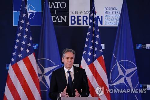 epa09948835 US Secretary of State Antony Blinken speaks during a press conference on the occasion of a NATO Foreign Ministers Meeting in Berlin, Germany, 15 May 2022. NATO's Ministers of Foreign Affairs meet from 14 to 15 May 2022 in Berlin. EPA/CLEMENS BILAN