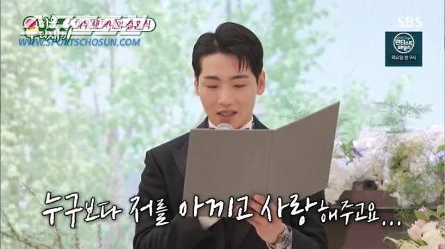 이상민은 "박군에게는 못난 형들이 많다"며 '성혼선언문'을 탁재훈에게 읽어달라 부탁했다. 탁재훈은 "나 옷도 이렇게 입었는데"라며 당황했지만 이어 박군 한영의 결혼을 축하하는 마음을 담아 성혼선언문을 낭독했다.