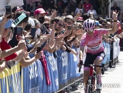 epa09948875 The overall leader, Spanish rider Juan Pedro Lopez of Trek-Segafredo team, greets spectators at the start of the 9th stage of the 105th Giro d'Italia cycling tour, over 191 km from Isernia to Blockhaus (Chieti), Italy, 15 May 2022. EPA/MAURIZIO BRAMBATTI EPA-EFE/MAURIZIO BRAMBATTI