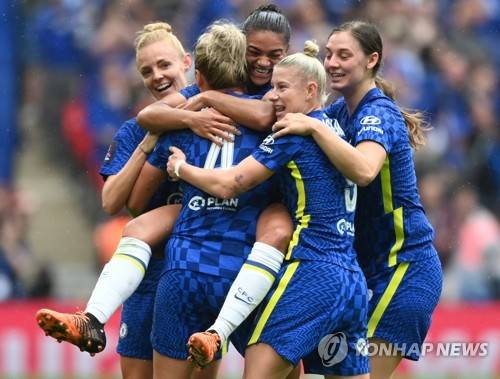 epa09948894 Chelsea players celebrate their 1-0 lead during the women's English FA Cup final between Chelsea FC Women and Manchester City WFC at Wembley in London, Britain, 15 May 2022. EPA/NEIL HALL EDITORIAL USE ONLY. No use with unauthorized audio, video, data, fixture lists, club/league logos or 'live' services. Online in-match use limited to 120 images, no video emulation. No use in betting, games or single club/league/player publications